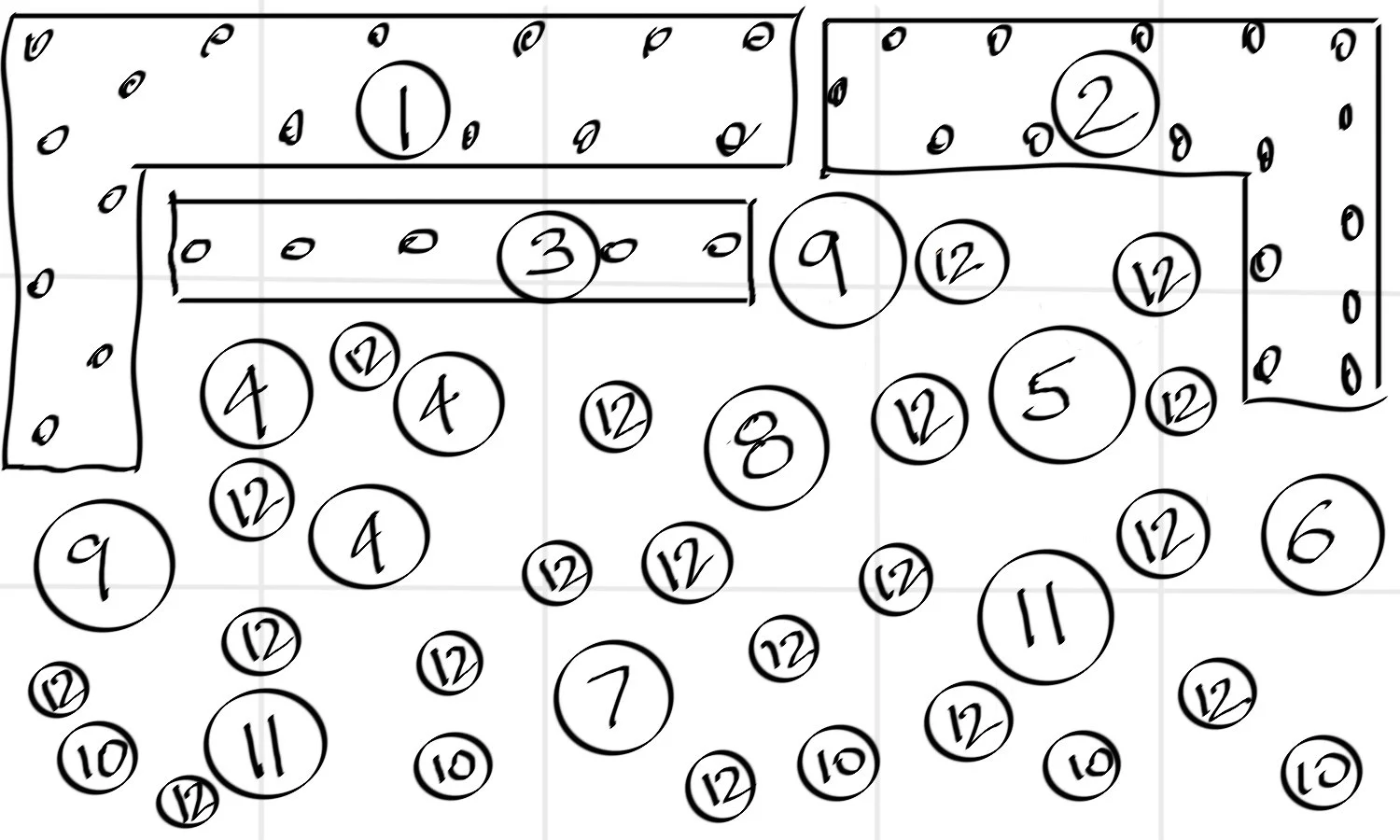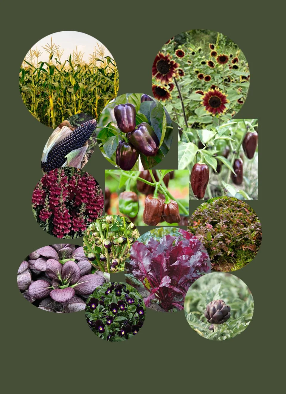 Rectangular design with 3’-6’ tall plants on the back and sides, creating an enclosed feel for the design. All the plants featured have parts “black” in color, from vegetables and flowers to leaves. 12 different plants total, including peppers, salad leaves, and cut flowers.